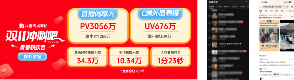 《雙十一沖刺吧·青春聯(lián)歡會(huì)》直播觀看人次突破676萬(wàn),峰值在線人數(shù)達(dá)34.3萬(wàn),遠(yuǎn)超同期同類直播均值。同時(shí),直播陣容與內(nèi)容在抖音站內(nèi)快速引爆,#鄭愷李晨王祖藍(lán)雙11合體錄制#、#何潔黃雅莉一開嗓夢(mèng)回超級(jí)女聲#等13個(gè)話題下的相關(guān)視頻在兩天內(nèi)爆火出圈,總播放量快速破百萬(wàn)。隨后,直播嘉賓自發(fā)的衍生內(nèi)容更是在多平臺(tái)全網(wǎng)出圈,討論度直接把#李晨鄭愷王祖藍(lán)合體玩黑咖啡梗、#李晨曬與王祖藍(lán)合照等話題沖上各類熱點(diǎn)榜單高位,創(chuàng)造出跨代際、破圈層、全平臺(tái)的傳播影響力。