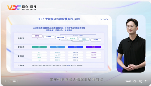 vivo Al工程架構師劉東陽則表示,VTraining訓練平臺是在容器能力之上構建,支撐vivo手機的藍心小V等核心產品的大模型訓練業務。在大規模訓練穩定性實踐中,通過減少基礎設施高頻故障、完善任務故障處置流程兩大措施,成功實現了機器每日故障率從2%降低到1‰的突破,千卡任務有效訓練時長從60%提升到99%,達到行業一流水平。平臺在GPU利用率提升實踐中,通過低優任務、訓推潮汐部署、GPU虛擬化等策略,深度適配差異化業務場景,實現了資源的高效復用。